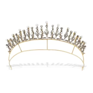 Exuding grace and opulence, this Edwardian Pearl and Diamond Tiara is a spectacular work of wearable art. Designed with a rising spray motif, this tiara mimics the natural upward movement of floral stems in bloom, crowned by natural pearls and shimmering rose-cut diamonds.