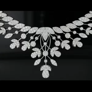 With remarkable ingenuity, this stunning tiara transforms into a sophisticated necklace. The central motifs seamlessly adapt to drape beautifully along the collarbone, complemented by a delicate diamond-set chain, making it a statement of refined glamour for any prestigious event.