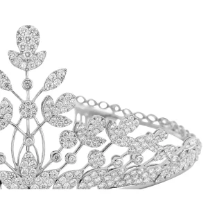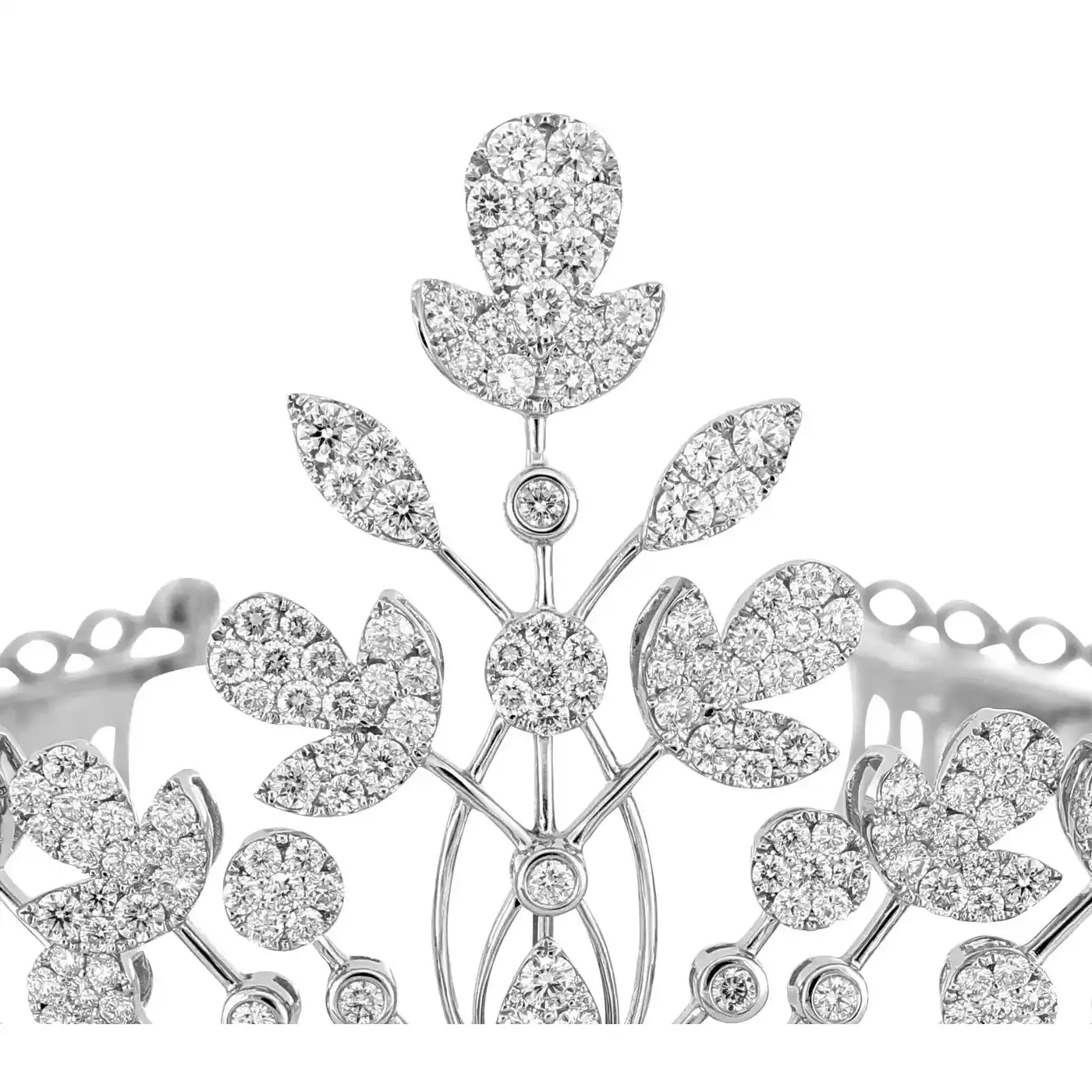 The tiara features an intricate floral and foliate design, where each petal and leaf is brought to life by scores of pave-set diamonds, creating a dazzling display of light and artistry. It rests gracefully, bestowing an aura of ethereal elegance upon the wearer.