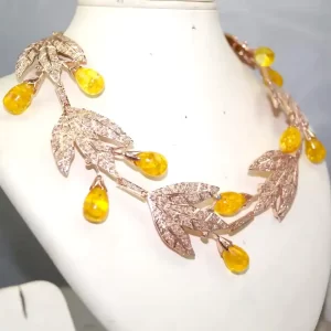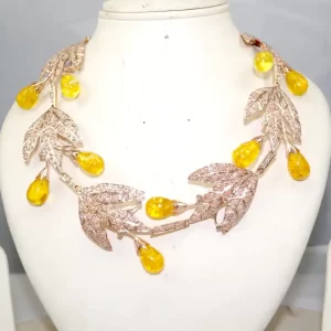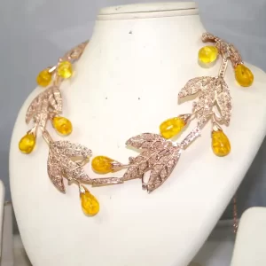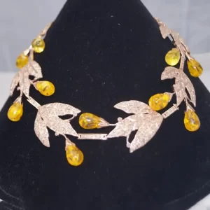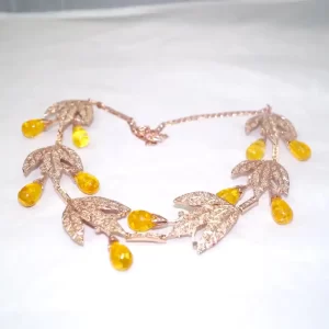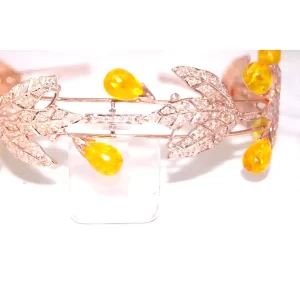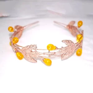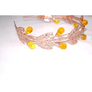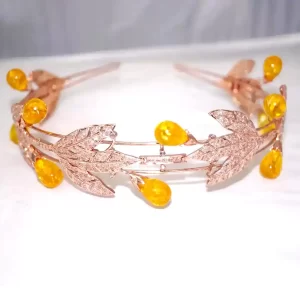Celebrate the beauty of nature with this Golden Harvest Leaf Tiara, a charming and whimsical piece that brings together vintage elegance and autumnal warmth. Crafted in glowing rose gold-tone metal, this tiara features sparkling pavé-set leaf motifs that intertwine gracefully across the band. Nestled between the leaves are luminous yellow teardrop cabochon stones, evoking the look of ripe golden berries or morning dew.
