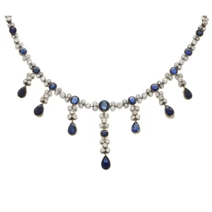 Command attention with this stunning Royal Blue Sapphire & Diamond Tiara, an exceptional statement piece that embodies noble elegance and old-world luxury. Set in a striking spiked pattern, this tiara features alternating teardrop and round-cut deep blue sapphires, framed by glittering old-cut diamonds, creating a dramatic silhouette reminiscent of royal insignias.