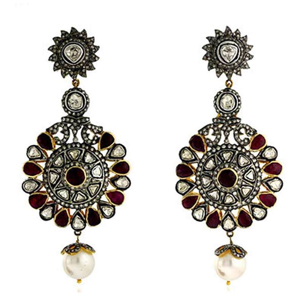 costozon rose cut earrings Total carat weight 18.26 TCW, 4.6 Carat Natural Rose cut Diamond, 1.66 Carat Polki Uncut Diamond and 12 Carat Ruby, Pearl Studded in 18 Gms 925 Sterling Silver fine vintage jewelry Online with IGL Certification, Free Shipping, BIS Hallmark, 30 Day Easy Return