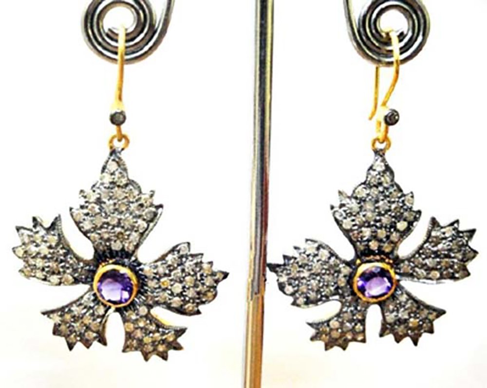costozon uncut earrings Total carat weight 3 TCW, 2 Carat Natural Rose cut Diamond and 1 Carat Amethyst Studded in 7 Gms 925 Sterling Silver art deco jewelry Online with IGL Certification, Free Shipping, BIS Hallmark, 30 Day Easy Return