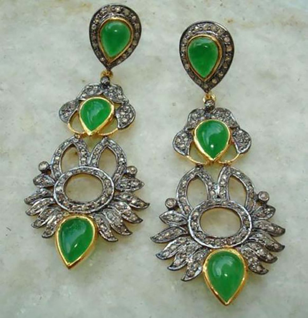 costozon uncut earrings Total carat weight 5.68 TCW, 2.68 Carat Natural Rose cut Diamond and 3 Carat Emerald Studded in 9.38 Gms 925 Sterling Silver antique jewelry Online with IGL Certification, Free Shipping, BIS Hallmark, 30 Day Easy Return