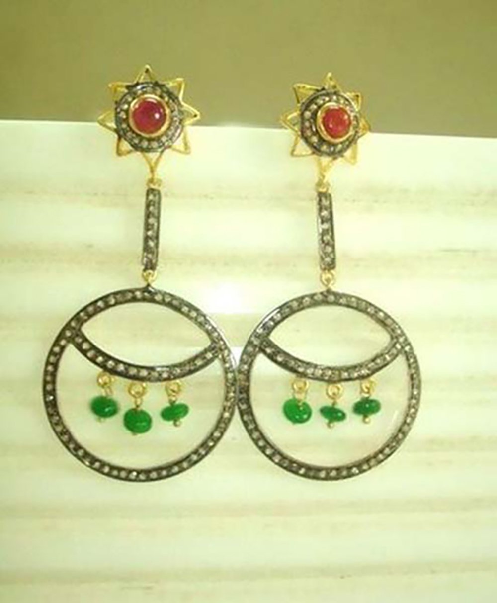 costozon victorian earrings Total carat weight 3.7 TCW, 2.5 Carat Natural Rose cut Diamond and 1.2 Carat Emerald, Ruby Studded in 8.75 Gms 925 Sterling Silver vintage jewelry Online with IGL Certification, Free Shipping, BIS Hallmark, 30 Day Easy Return