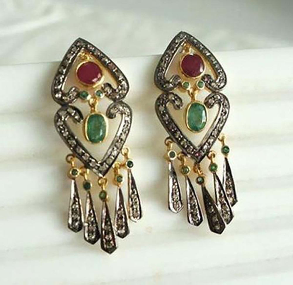 costozon vintage earrings Total carat weight 4.28 TCW, 2.08 Carat Natural Rose cut Diamond and 2.2 Carat Emerald, Ruby Studded in 10.4 Gms 925 Sterling Silver vintage diamond jewelry Online with IGL Certification, Free Shipping, BIS Hallmark, 30 Day Easy Return