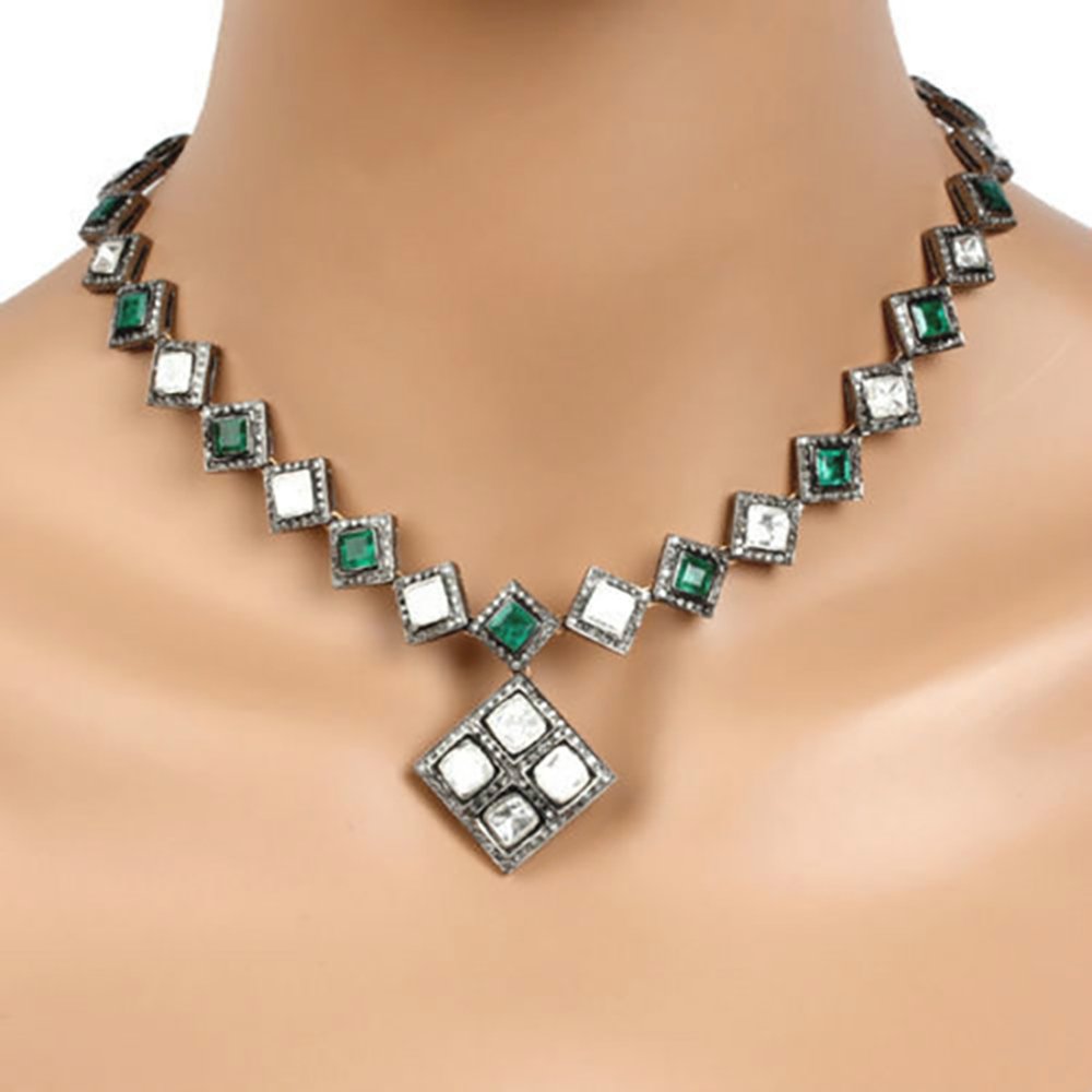 costozon polki necklace Total carat weight 31.1 TCW, 9.6 Carat Natural Rose cut Diamond, 4.5 Carat Polki Uncut Diamond and 17 Carat Emerald Studded in 70.5 Gms 925 Sterling Silver fine vintage jewelry Online with IGL Certification, Free Shipping, BIS Hallmark, 30 Day Easy Return
