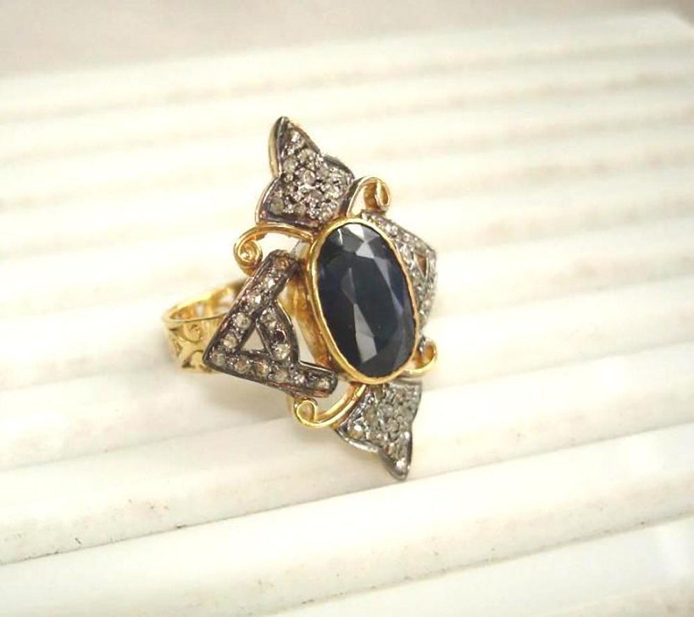 costozon vintage engagement rings Total carat weight 4.3 TCW, 1.3 Carat Natural Rose cut Diamond and 3 Carat Blue Sapphire Studded in 6.5 Gms 925 Sterling Silver antique jewelry Online with IGL Certification, Free Shipping, BIS Hallmark, 30 Day Easy Return
